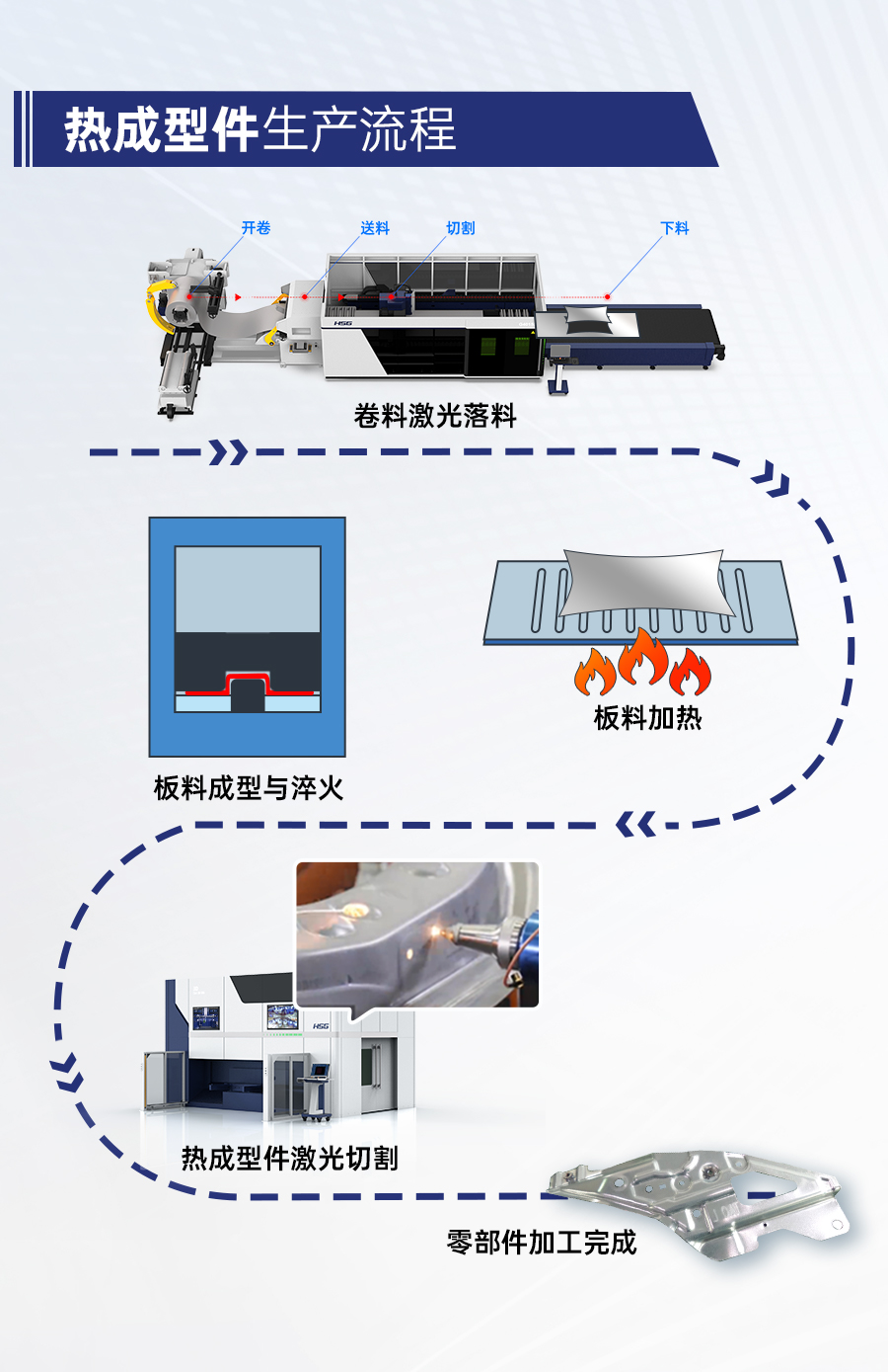 宏山激光GL系列卷料激光切割機搭配Cell系列三維五軸激光切割機,可實現高強鋼料卷的自動化落料、以及熱成型三維工件的高精度切割,從生產工序上助力實現輕量化目標。